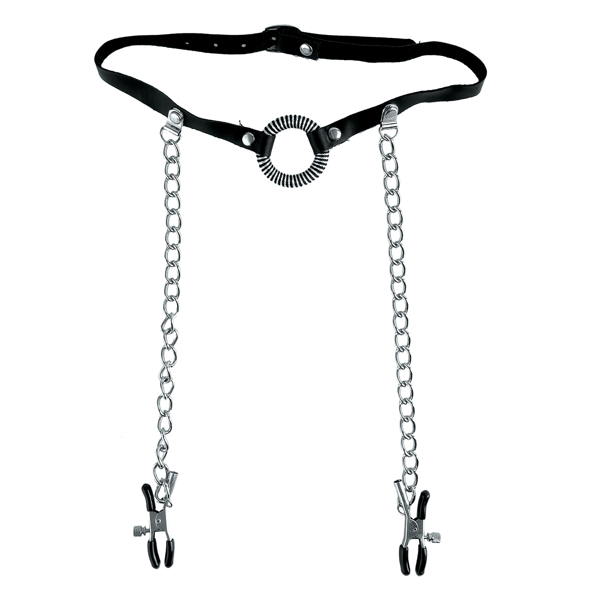 Кляп на кожаном ремешке является прочным и выполнен в классическом стиле расширителя в виде кольца, который удерживает рот открытым, в то время как зажимы с регулируемым давлением прочно крепятся к соскам. Помимо того, что комплект усиливает сверхчувствительность и готовность к действиям, сами зажимы действуют как сдерживающее средство, поскольку они крепятся к кольцу через прочные цепи. Любое движение головы потянет зажимы.