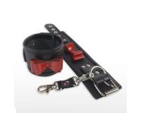 Отрегулировать по размеру девайс можно при помощи металлической пряжки. Вся используемая металлическая фурнитура имеет никелевое покрытие. На наручниках располагаются полукольца, для соединения их между собой при помощи двух карабинов, скреплённых кожаным ремешком.
