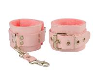 Нежные наручники из искусственной лаковой кожи бледно-розового цвета. Внутренняя сторона изделия отделана мягким искусственным мехом. Соединяются наручники при помощи перемычки с двумя карабинами. Длина наручника 30 см, ширина 5,5 см.
