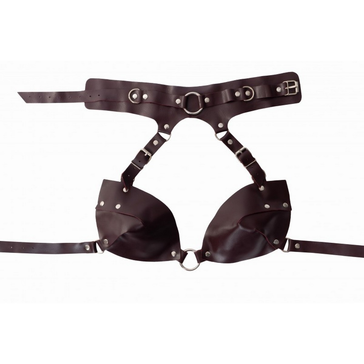 Роскошная сбруя выполнена из натуральной кожи бордового цвета. Высокий ошейник с металлическим кольцом спереди  присоединяется к изысканному кожаному лифу. Сбруя фиксируется ремнями и пряжками, позволяющими подобрать нужный размер. Ширина ошейника 5,5см, подходит на обхват от 31 до 42см. Шинира ремешков 2см. Размер универсальный  . Страстный аксессуар станет отличным дополнением к БДСМ игре.